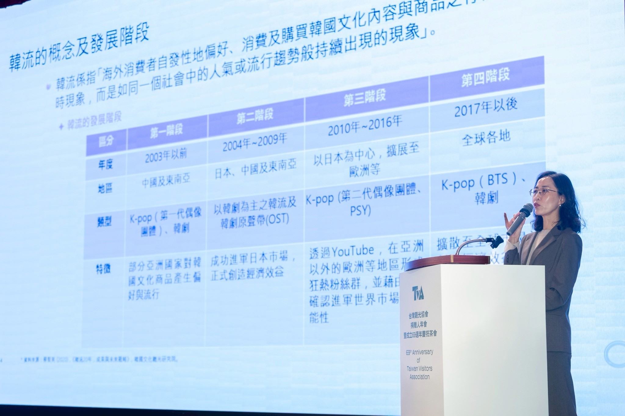 韓國文化觀光研究院觀光研究本部長李元熙分享,韓國計劃性地以韓流(K-Culture)發展策略提升國家形象,並增加鄰近市場、更進一步帶動全球旅客造訪,讓韓國入境旅遊市場多元化。透過開發韓流體驗活動和課程,增加旅客停留時間,並舉辦大型活動及演出,擴大旅客造訪首爾以外的城市。她指出,韓國熟悉台灣影視文化,台灣人民親切、環境安全且美食多元,具高度觀光潛力,韓國對台灣的文化熟悉及好感度高,可借鏡韓國結合文化及觀光政策的推動策略。