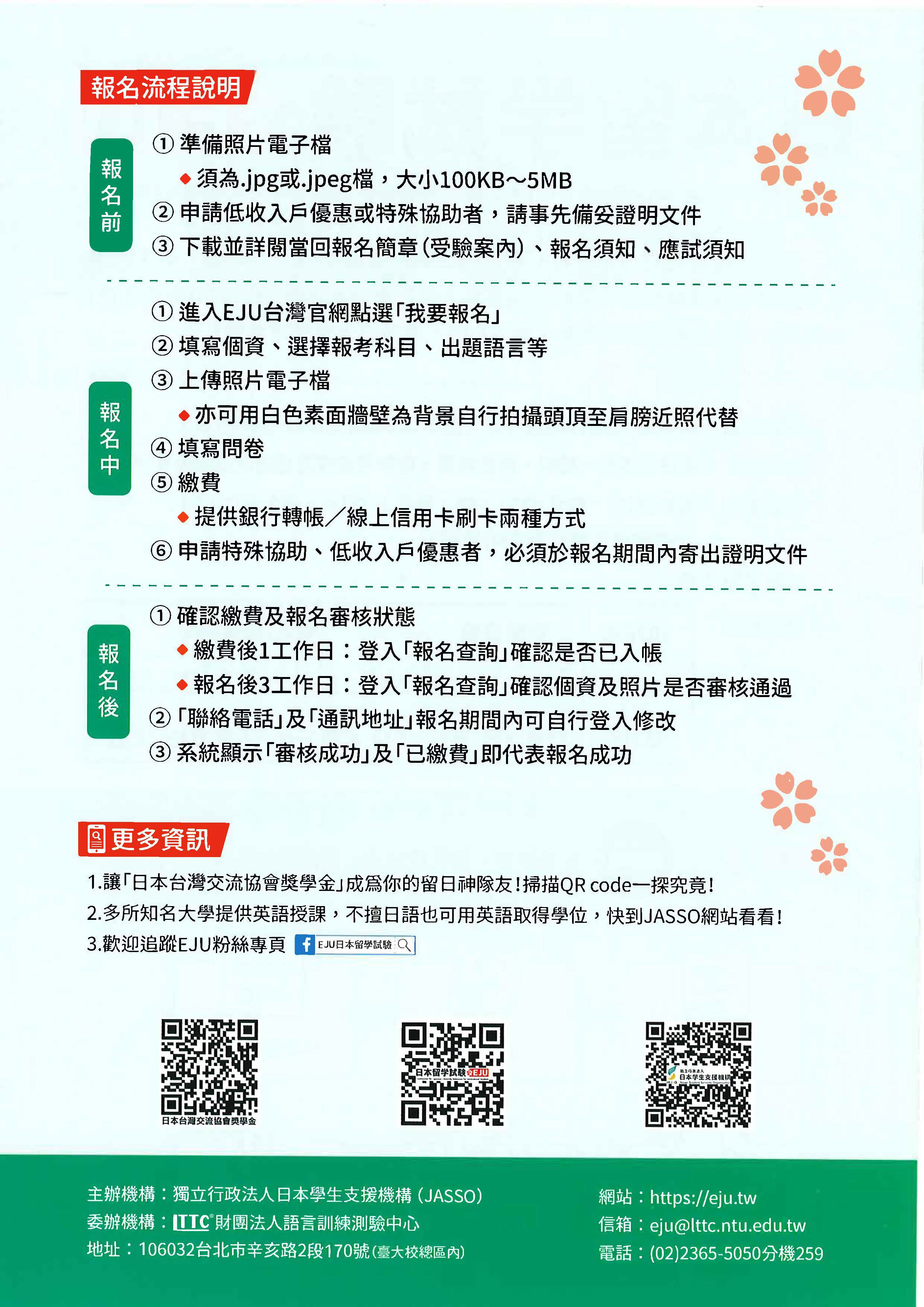 二、台灣考區採網路報名,線上即可完成報名手續。相關資訊請瀏覽 EJU官網 https://eju.tw。